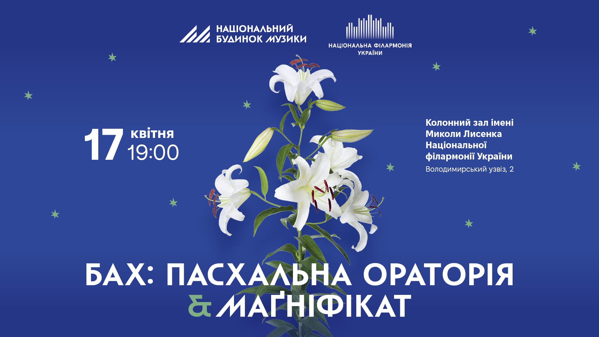 КвиткиСпільний проєкт Open Opera Ukraine, Національного будинку музики та Національної філармонії України із запрошеним диригентом Йорґом Цвікером. За підтримки #UkraineOfficeAustria та Посольства Австрії в Україні Програма концерту: Й.С.Бах: - Пасхальна Ораторія - Маґніфікат Диригує Йорґ Цвікер (Австрія) Виконавці: Олеся Люба /сопрано/ Олена Піньковська /сопрано/ Владислава Приймачук /мецо-сопрано/ Роман Меліш /контратенор/ Денис Сагіров /тенор/ Роман Арабаджі /бас-баритон/ Тамара Рой /флейта/ Володимир Коваль /гобой дʼамур/ Тетяна Гречанівська /віолончель/ Наталія Фоменко /клавесин, орган-позитив/ Liatoshynskyi Capella Наталія Хмілевська /хормейстерка/ Костянтин Ленчик /хормейстер/
