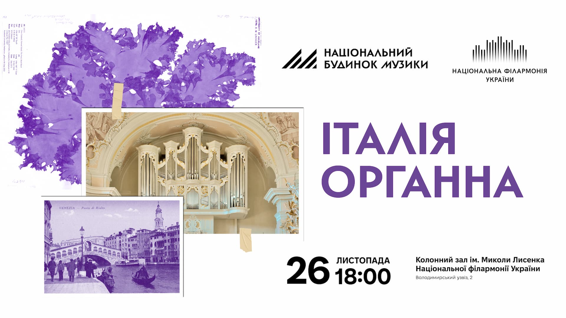 TicketsПрограма: І відділ А. Вівальді – Концерт для лютні з оркестром, транскрипція для органа М. Маккели, RV 94 А. Марчелло-Й.С. Бах – Концерт, BWV 974, транскрипція для органа Г. Бубнової Р. Джадзотто — Adagio соль мінор (Adagio Альбіноні). Транскрипція для органа Г. Бубнової М.Е. Боссі – Intermezzo Lirico / Ліричне інтермеццо та Entre / Вихід ІІ відділ А. Вівальді – Й.С. Бах – Концерт, BWV 593 М.Е. Боссі – Скерцо, op. 49 В. Петралі – Три версета «Per il Gloria» – Ґранде соната Це справжня подорож у світ італійської органної музики, яка протягом століть надихала Європу так само, як архітектура Флоренції, собори Рима чи лагуни Венеції. Усі твори вечора — від барокових концертів Вівальді та Марчелло до романтичних інтермецо Марко Енріко Боссі й версетів Вінченцо Петралі — належать італійським майстрам, чиї мелодії могли звучати під склепіннями найвеличніших храмів країни. Виконавці: Валерія Балаховська орган Ганна Бубнова орган