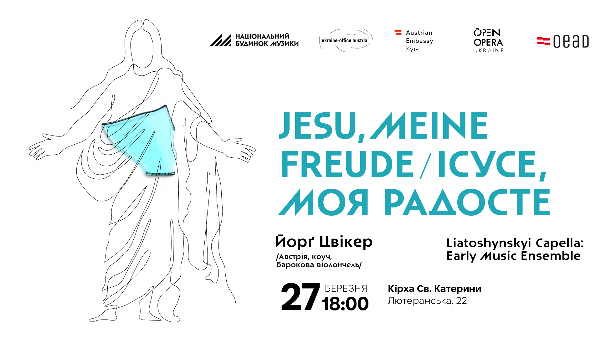 TicketsConcert Program: Heinrich Schütz — O süsser, o freundlicher, from Kleine geistliche Konzerte I, Op. 8 Johann Rosenmüller — Ist Gott für uns, from Andere Kern-Sprüche Johann Rosenmüller — Sinfonia Seconda in D major, from Sonate e sinfonie da camera Heinrich Schütz — Habe deine Lust an dem Herren, SWV 311 Johann Rosenmüller — Das ist meine Freude, from Andere Kern-Sprüche Dieterich Buxtehude — Sonata in D minor for Violin, Viola da Gamba and Basso Continuo, Op. 1 No. 6, BuxWV 257 Dieterich Buxtehude — Cantata Jesu, meine Freude, BuxWV 60 Performers: Jörg Zwicker (Austria) /Coach, Baroque Cello/ Liatoshynskyi Capella: Early Music Ensemble The program “Jesu, meine Freude / Jesus, My Joy” brings together sacred music of the 17th-century German Baroque, united by themes of joy, light, and hope. Works by Heinrich Schütz, Dieterich Buxtehude, and Johann Rosenmüller create a space for attentive listening, where word and music merge into a profound inner experience of faith, trust, and community. This program carries special meaning through the participation of cellist Jörg Zwicker, a great friend of Ukraine, whose visit takes place with the support of Open Opera Ukraine. This is not his first visit: for many years he has regularly come to Ukraine, supported Ukrainian musicians, and worked alongside them even during the difficult times of war. His presence is always a deep joy for us and a true sign of solidarity.