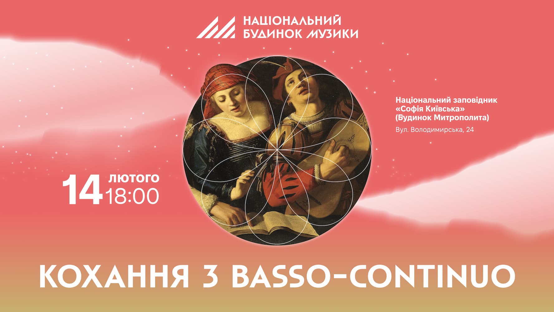 TicketsПам’ятаєте, як ви освідчувалися в коханні? Було, мабуть, хвилююче? От і ми будемо хвилюватися. Бо будемо освідчуватися в коханні basso-continuo. Це почуття у нас триває вже дуже довго та воно міцніє і міцніє. Бо basso-continuo в бароковій музиці — це про свободу, довіру, спонтанність і про любов. Це про спільний кайф у музикуванні та пошуку і знаходженні кожного разу чогось нового. Презентуємо програму із маловідомих творів та хітів давньої музики, в яких оспівується кохання в усіх його емоційних складових. Але це все буде без супроводу оркестру, а із групою basso-continuo, що зробить концерт інтимним та чуттєвим. Програма концерту: - Алєссандро Ґранді — O, quam tu pulchra es - Роберт Джонсон — Have you seen but a white Lily grows - Генрі Перселл — Арія O let me weep - Генрі Перселл — Дует My dearest , my fairest - Бенедетто Марчелло — Соната соль мінор, op. 2, No 11 - Джуліо Каччіні — Мадригал Amarilli, mia bella - Клаудіо Монтеверді — Quel sguardo sdegnosetto - Антоніо Вівальді — Арія Allor che lo squardo - Жан-Фліпп Рамо — L'Entretien des Muses - Клаудіо Монтеверді — Мадригал Si dolce e'l tormento - Тарквініо Мерула — Арія Folle ben che si crede - Генрі Перселл — Дует Love thou art best - Анонім — Кант «Через річку по помості» - Анонім — Кант «Ой перестань, мой наймильший до мене ходити» - Анонім — «Щирим серцем і любилем»