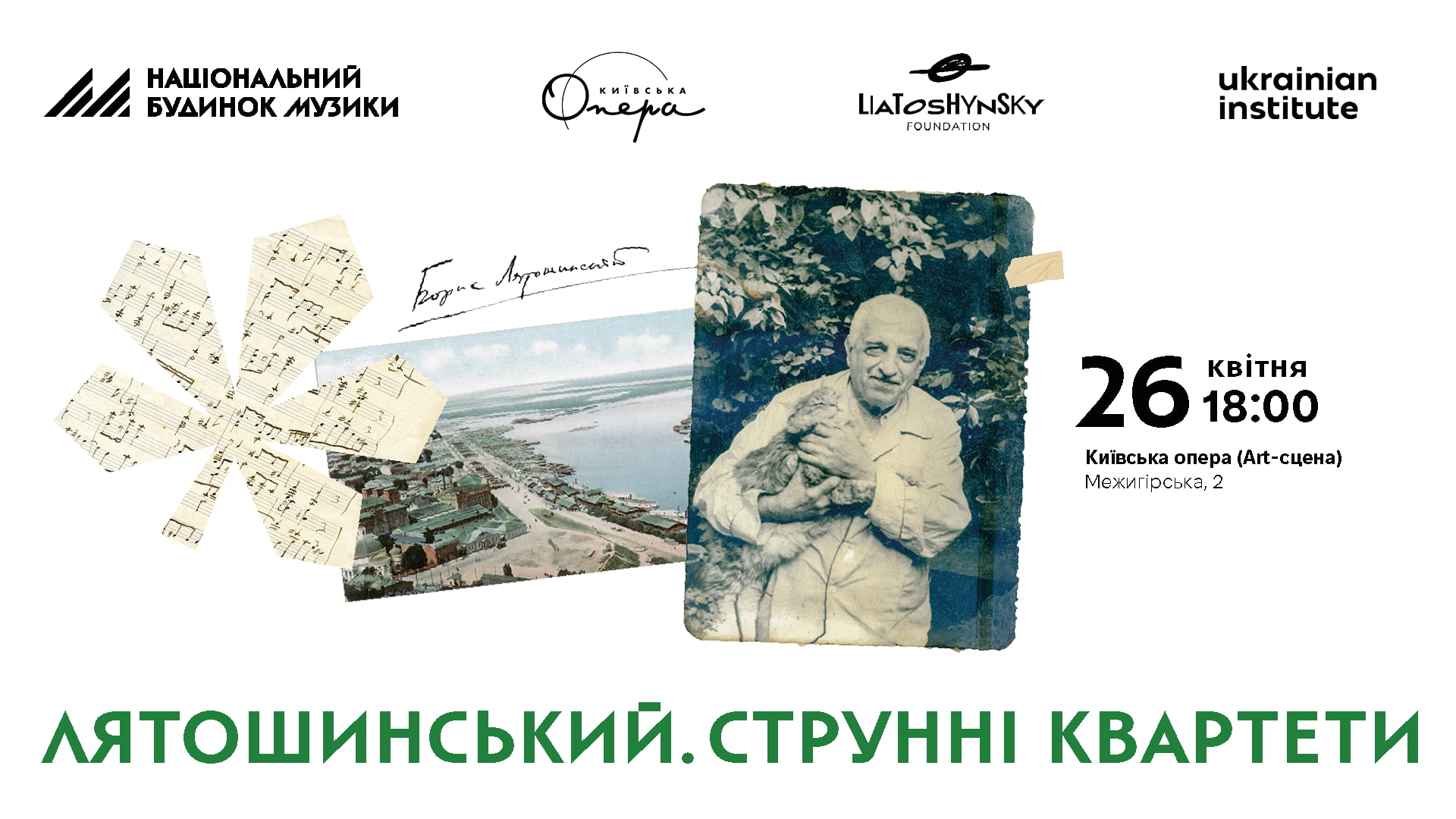 TicketsConcert Program: Borys Lyatoshynskyi — String Quartet No. 2, Op. 4 Borys Lyatoshynskyi — String Quartet No. 3, Op. 21 Performers: NotaBene Chamber Group: Andrii Pavlov /violin/ Maksym Hrinchenko /violin/ Ihor Zavhorodnii /viola/ Artem Poludennyi /cello/ Last year, on the occasion of the 130th anniversary of Borys Lyatoshynskyi’s birth, the Ukrainian Institute presented an edition of all the composer’s string quartets as part of the Anthology of Ukrainian Chamber Music. An important feature of this publication is the presentation of two editorial versions: the Urtext (essentially a printed version of the composer’s manuscripts) and a performance edition prepared by the NotaBene Chamber Group. On April 26, this edition can be not only seen but also heard live. Andrii Pavlov (violin), Maksym Hrinchenko (violin), Ihor Zavhorodnii (viola), and Artem Poludennyi (cello) will perform two string quartets by Borys Lyatoshynskyi, revealing not only the traits of Western European modernism in the composer’s work, but also echoes of Ukrainian, Kyiv sound of the 1920s.
