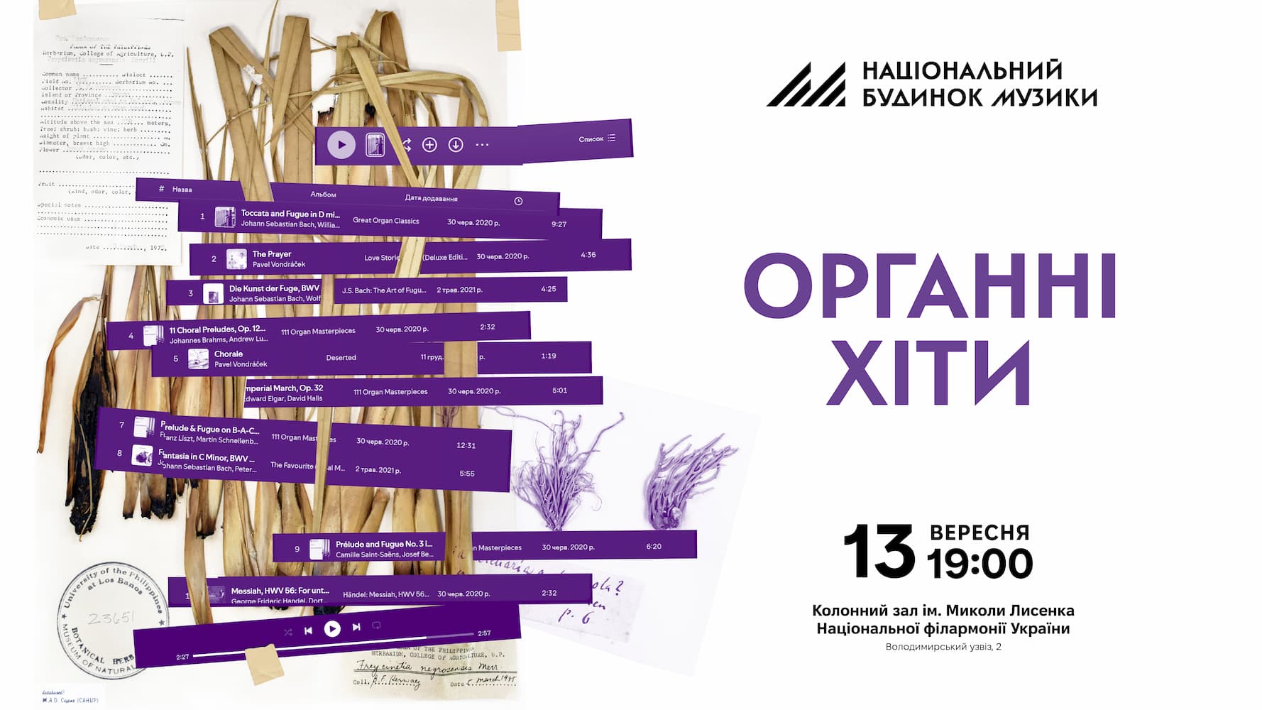 TicketsКонцертна програма «Органні хіти» — це плейлист найяскравішої органної музики кількох століть, яку можна почути не в навушниках, а наживо. Особливість будови органа, до того ж, змушує «грати» не лише інструмент, а й усе приміщення довкола нього, тож таке слухання відчувається буквально усім тілом. Відчуйте велич барокової музики Генрі Перселла та Йоганна Себастьяна Баха поруч із творами композиторів ХХ століття та наших сучасників, які досліджували можливості найвеличнішого інструмента. Програма концерту: І відділ - Генрі Перселл — Рондо з «Abdelazer» Йоганн Себастьян Бах: - Прелюдія і фуга сі мінор, BWV 544 - 4 хоральні прелюдії - «Vater unser im Himmelreich» / «Отче наш», BWV 683 - «Wenn wir in höchsten Nöthen sein» / «Коли ми будемо у великій скруті», BWV 641 - «Ich ruf zu dir, Herr Jesu Christ» / «Я взиваю до тебе, Господи, Ісусе Христе», BWV 639 - «Wer nur den lieben Gott läßt walten» / «Хто цілком належить Господові»), BWV 642 - Йоганн Себастьян Бах–Алессандро Марчелло — Концерт ре мінор в 3 частинах, BWV 974 (транскрипція для органа Ганни Бубнової) - Йоганн Себастьян Бах — Токата і фуга ре мінор, BWV 565 ІІ відділ - Ян Зварт — Токата на псалом 146 «Хваліте Господа» - Чарльз Вільєрс Стенфорд — Фінал з органної сонати №4 «Celtica», ор.153 - Ґі Бове — Три прелюдії - Фернанд де ла Томбель — Токата